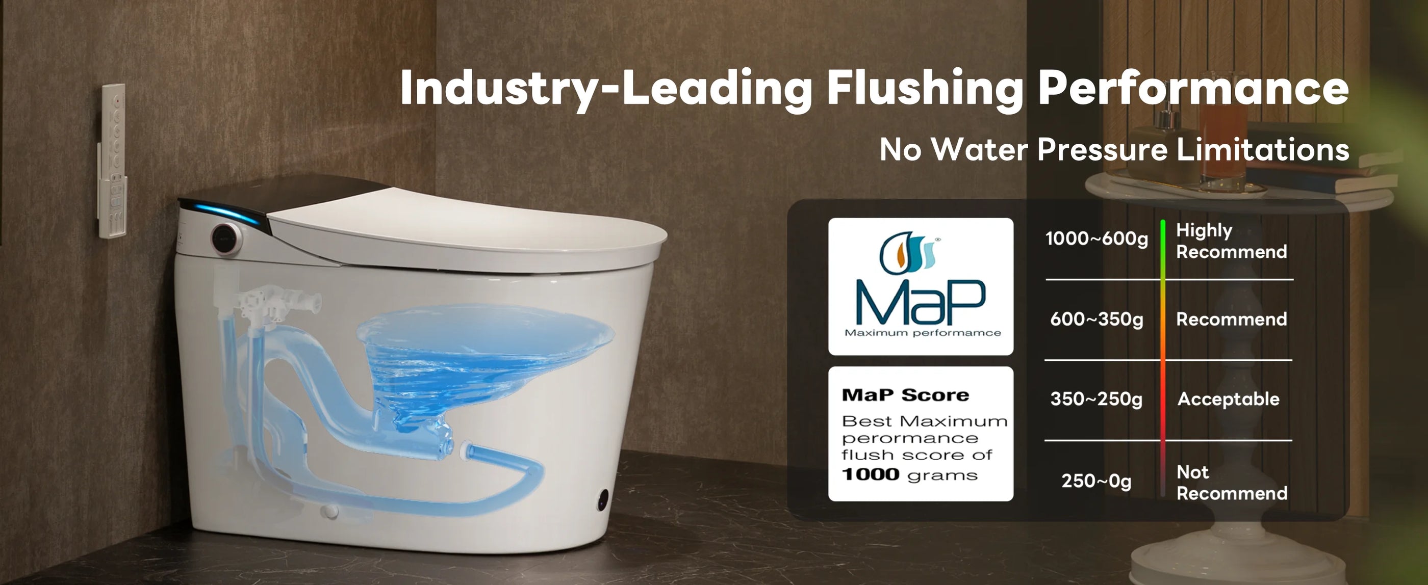 Space-saving design with powerful flushing, adapting to any water pressure